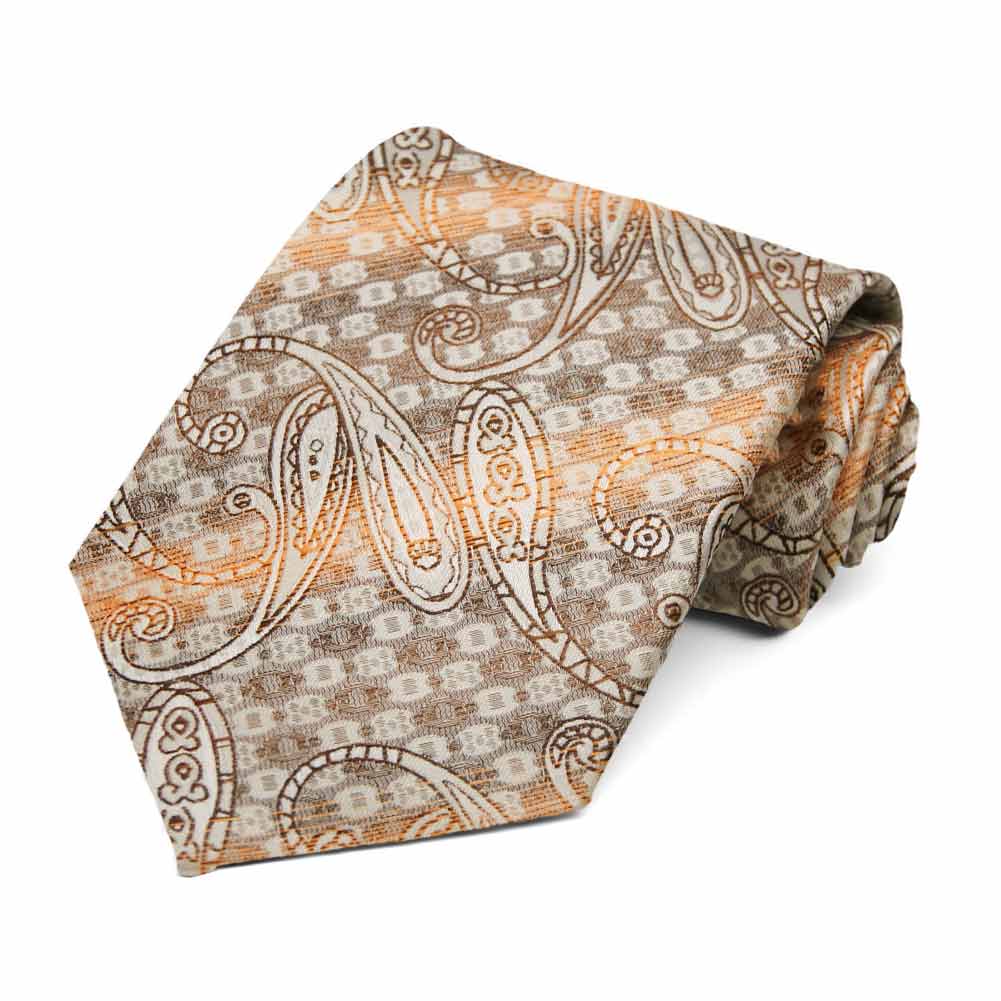 A subtle stripe pattern adorns the fanciful paisley background of this orange and brown tie. Just right for your fall and winter wardrobe! A matching pocket round is included for formal occasions. Pair this with a navy blue suit for an eye-catching pop of color.