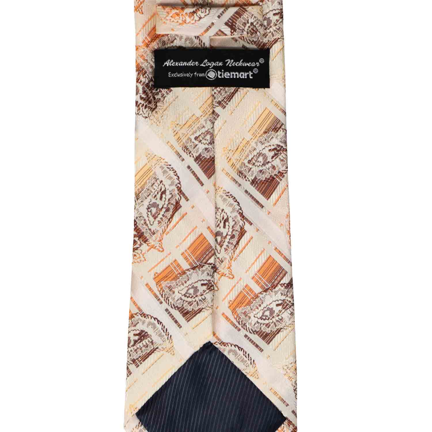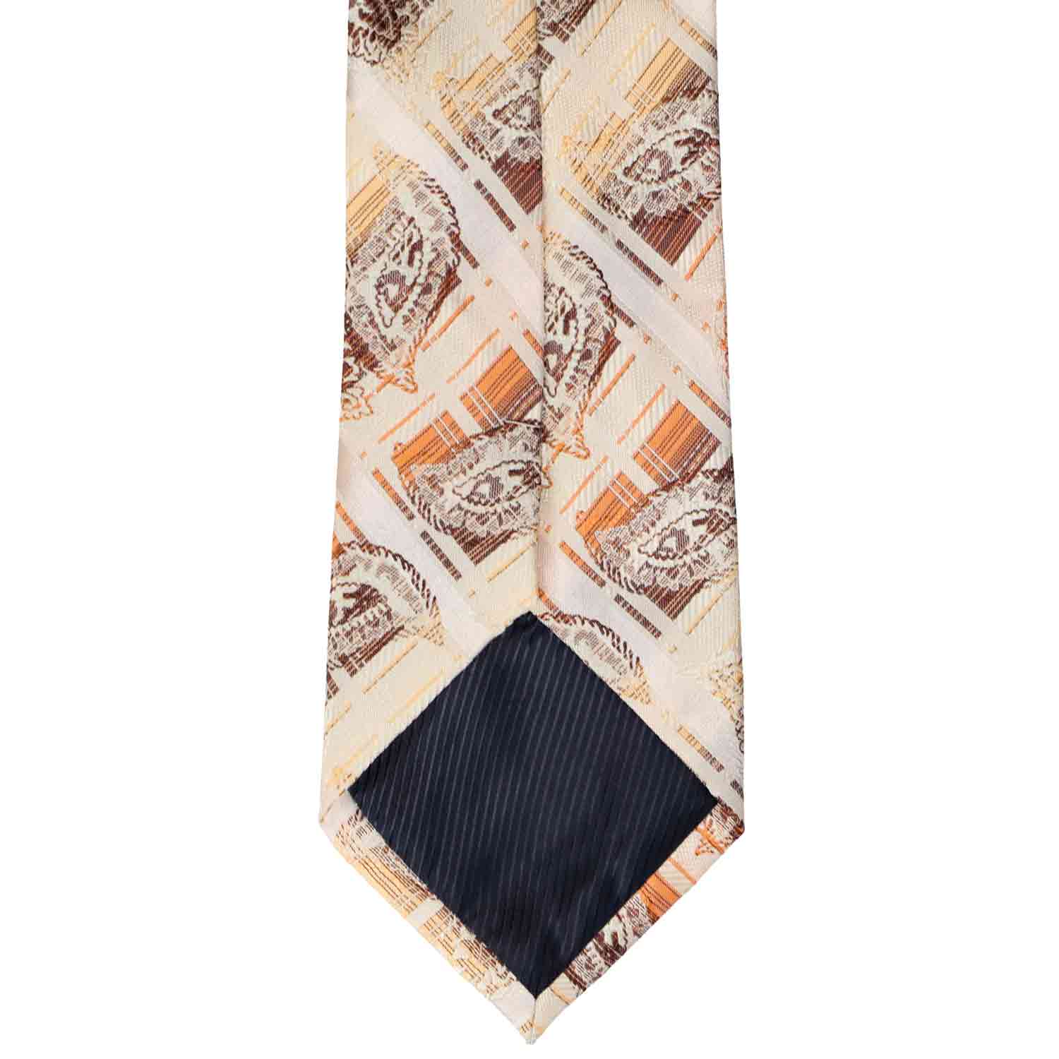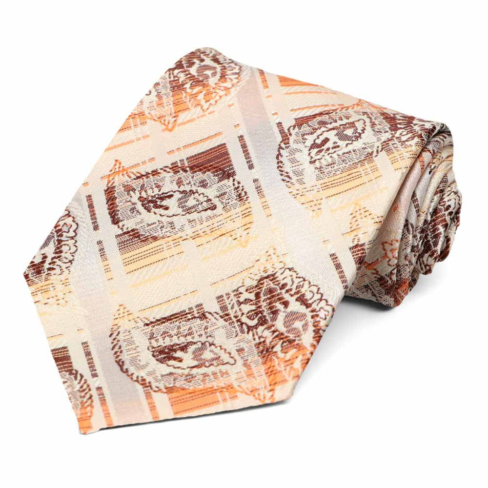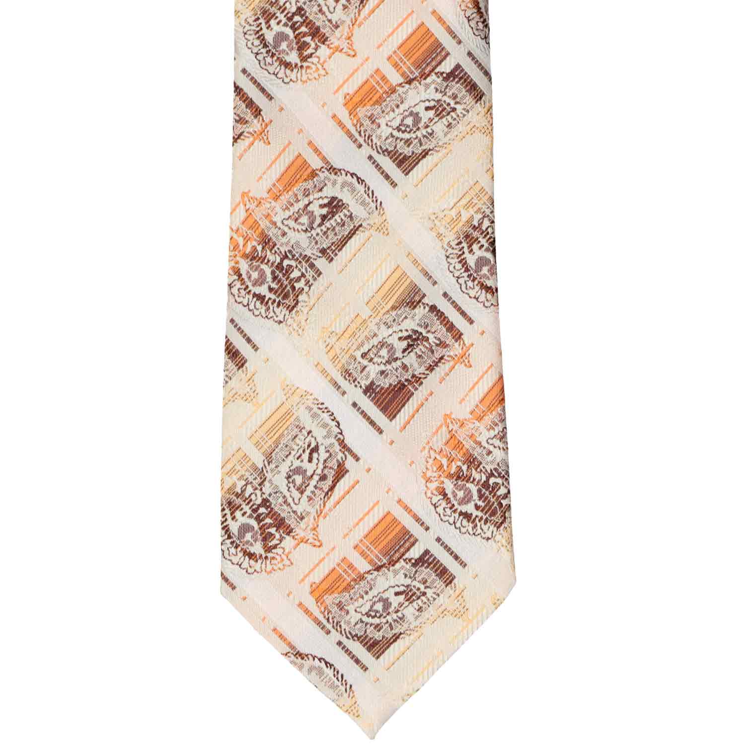 The classic appeal of plaid combined with a intricate paisley print. Brown paisley pops from the plaid background of this tan and orange tie. Wear this for a casual everyday office look, or dress it up with the included matching pocket round.