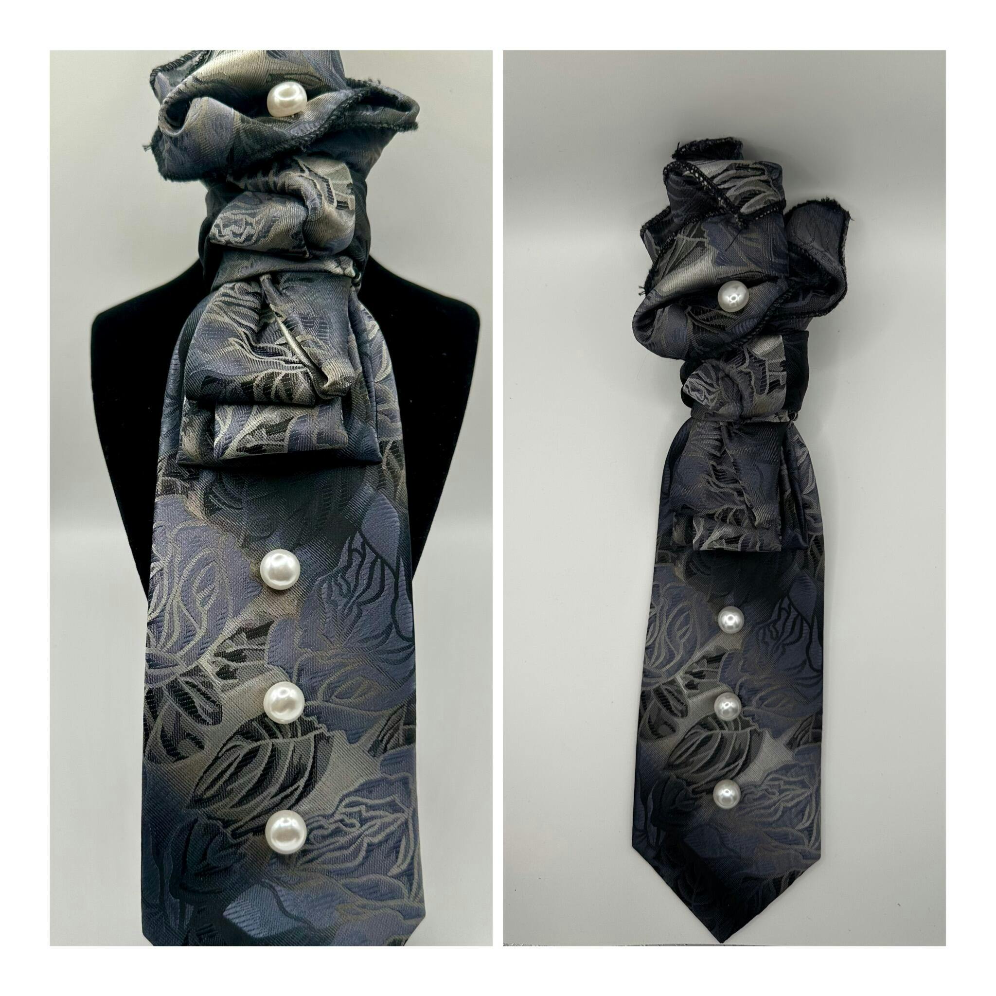 From the office to an evening out, this tie has you covered. A large gray floral print is paired with a silver background for an eye-catching, but not too busy look. We know you'll find many occasions to wear this tie, as it pairs well with everything. A matching pocket square is included for times when you want a more formal look. Wear it with a black suit and the included pocket square for a look that's sure to impress!