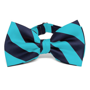 This turquoise and navy blue striped bow tie features a pre-tied, band collar style that expands to fit neck sizes up to 19-inches. Made from heavyweight woven material with a smooth, satin finish. Look for this color combo in a men's necktie, self-tie bow tie and socks.