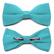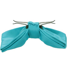 Wear a perfect bow every time with this turquoise clip-on bow tie. This pre-tied turquoise bow tie features a heavyweight clip that discretely attaches to either side of your shirt collar material for a secure fit. One size fits all, regardless of neck size. Soft, satin finish. See related products below for a matching cummerbund and pocket square.
