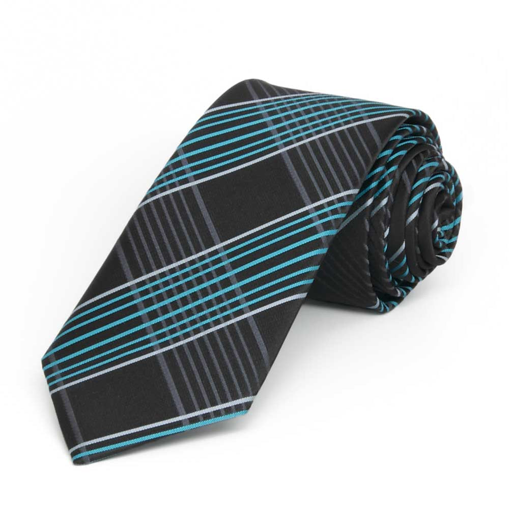 This sleek black slim tie features a timeless plaid design accented with vibrant turquoise details, making it a standout choice for the office. Its versatile "wear anywhere" style transitions seamlessly from workday meetings to evening events. Pair it with a black or gray suit for a polished and professional look. For more formal occasions, complete the ensemble with the matching pocket square (sold separately). A perfect blend of style and sophistication for your work wardrobe!