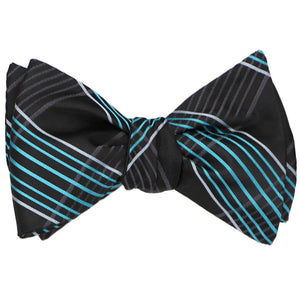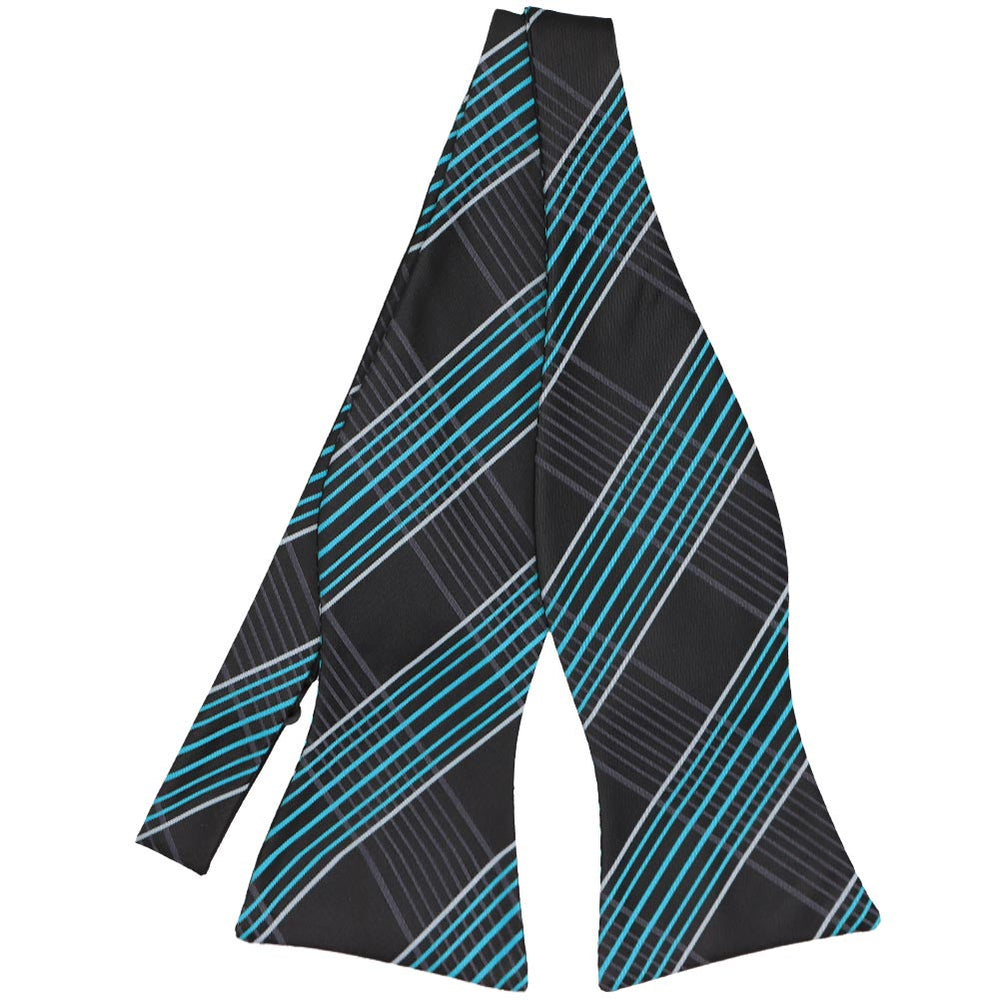 Dial up your style with this sleek black self-tie bow tie, featuring a classic plaid pattern with bold turquoise accents. The deep black background provides a sharp contrast, making it a standout accessory that effortlessly transitions from office wear to evening events. Perfectly paired with a black or gray suit, this bow tie adds a modern touch to any formal or semi-formal look. For an added touch of sophistication, complete your ensemble with the matching pocket square (sold separately).