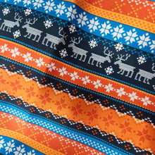 A women's scarf in a blue and orange ugly sweater pattern with reindeer and snowflakes, crossed over itself