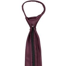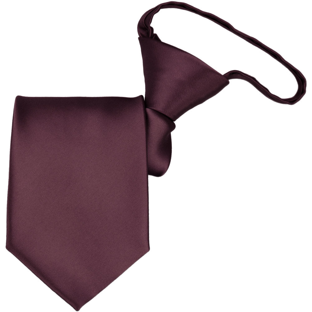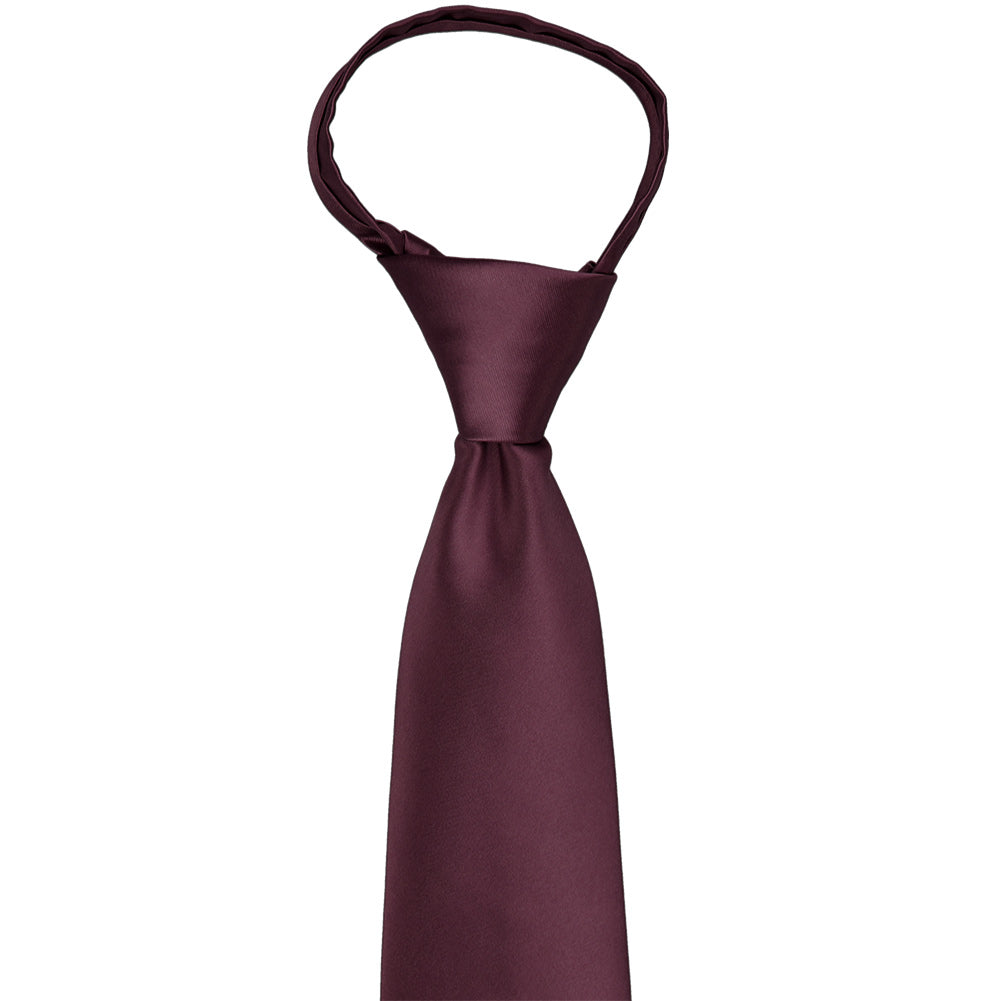 Get ready for your wedding day with this wine colored zipper tie. No need to tie this pre-tied tie, just zip it up and go! (If you’re new to zipper ties, take a look at the instructions below to learn the secret to keeping this tie secure.) The dark burgundy hue is one of our most popular ties for the groom and groomsmen. The deep hue lends itself to fall and winter weddings and looks stunning with navy blue or gray groomsmen suits.