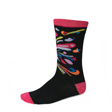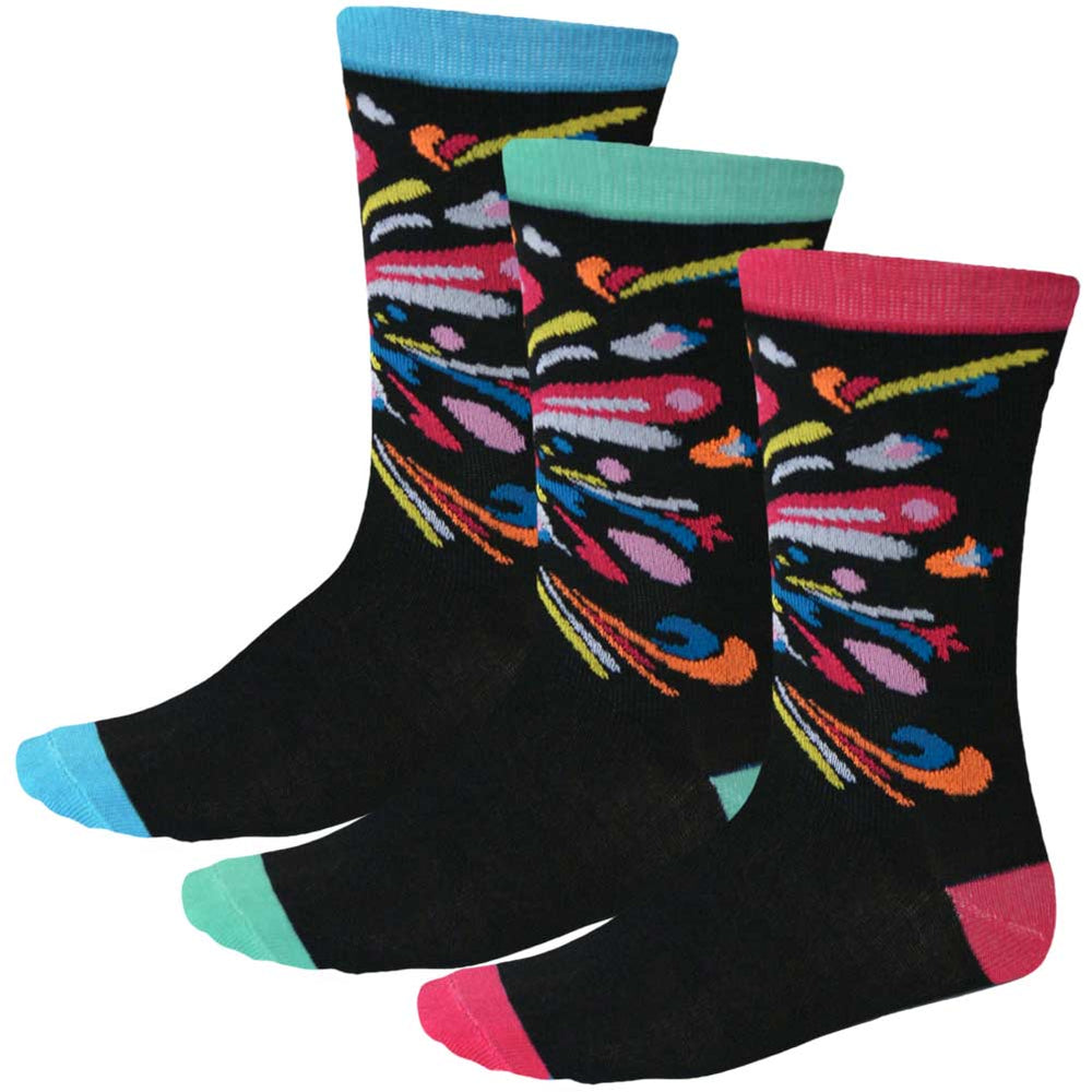 This 3-pack of women's socks features an abstract paisley design in radiant colors. The bursting pattern begins on the front of the sock and wraps around the side. The background of the socks are black and the heel, cuffs and toe are fuchsia, seafoam or blue.
