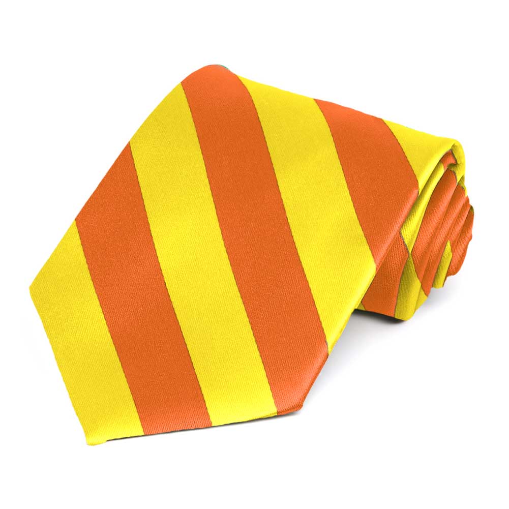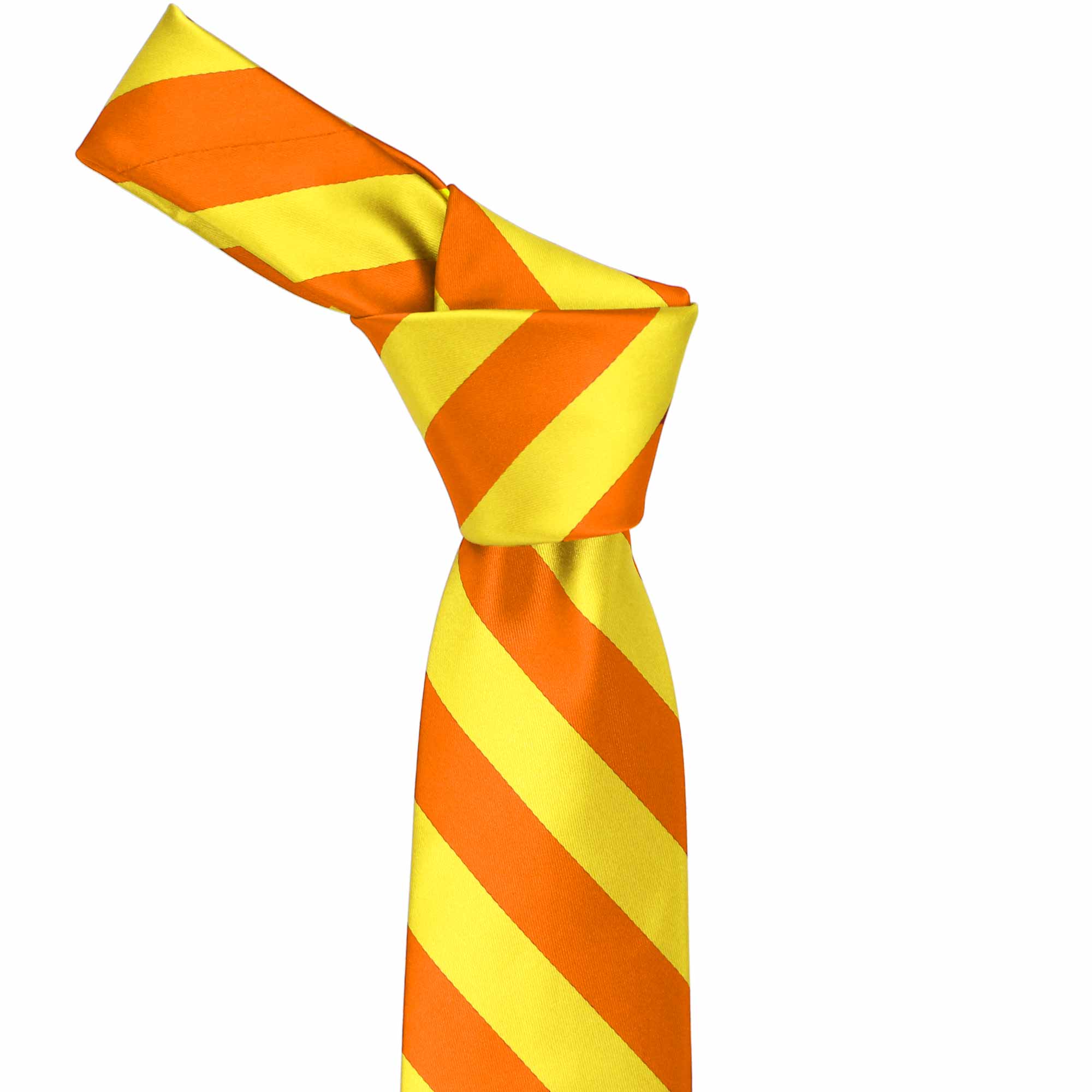Add a refreshing yet bold pop of color to your look with this yellow and orange striped tie. It conjures up images of summer sun and sidewalk lemonade stands, making it perfect for your warm weather attire. Pair it with your favorite navy blue suit for a formal occasion, and don't forget to purchase a solid yellow or solid orange pocket square for that finishing touch. (Look for our premium line of solid ties for those matching accessories.)