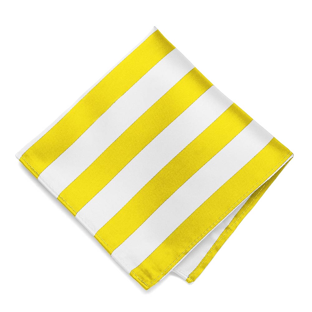 This yellow and white striped pocket square measures a large, 12-inches by 12-inches to suit a wide variety of folds. The tightly woven material creates a smooth finish for a sharp look. Matching ties and bow ties available to complete your look.