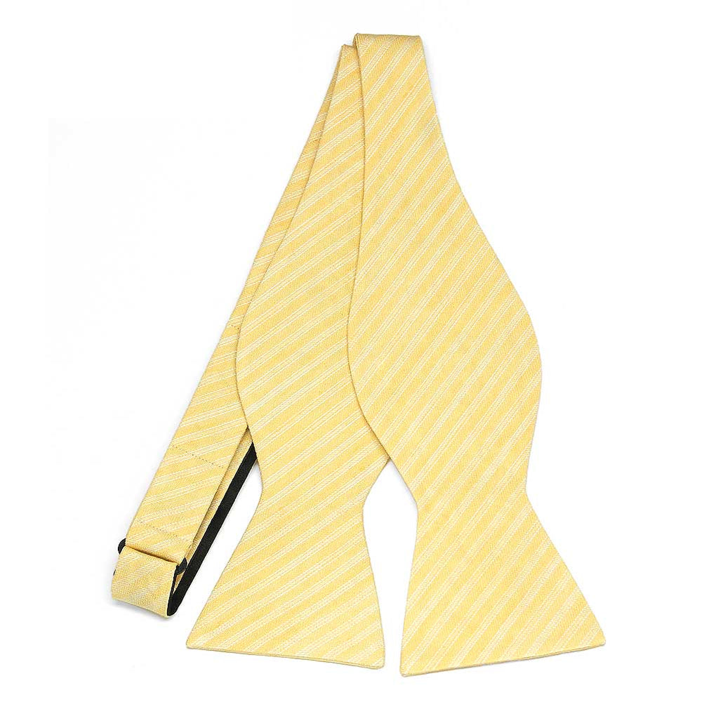 Welcome back sunshiny days and warmer weather by adding this cheery yellow self-tie bow tie to your spring and summer attire. The striped pattern makes this bow more interesting than a solid color bow tie, but the subtlety of the stripes makes it just as easy to coordinate. Wear it for everything from your wedding day to another day at the office. We think this one goes splendidly with a fitted navy blue suit.